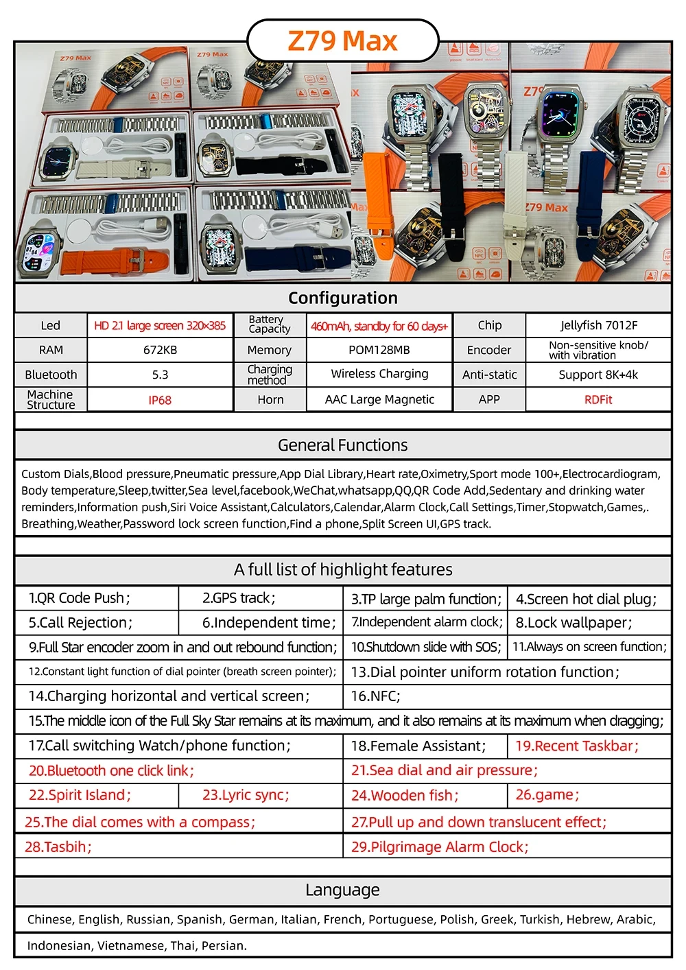 Model:Z79MAXSystem requirements:android5.0+ / ios10.0+Bluetooth version:5.3Battery capacity:460mAHKey method: full screen touch + three buttons + knobCharging interface:wireless chargingAPP:RDFit